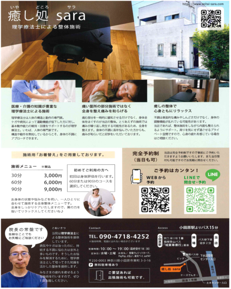 院長先生は理学療法士の資格をお持ちです。人体の構造と動作の専門家による施術で、痛む箇所だけではなく、全身のバランスを整えていきます。体が整うと、心のバランスも穏やかに。清潔感のある空間で“癒し”の時間をお過ごしください。目まぐるしい日々の中、たまにはご自身をいたわって、心も体も軽やかに新しい年をお迎えくださいませ。